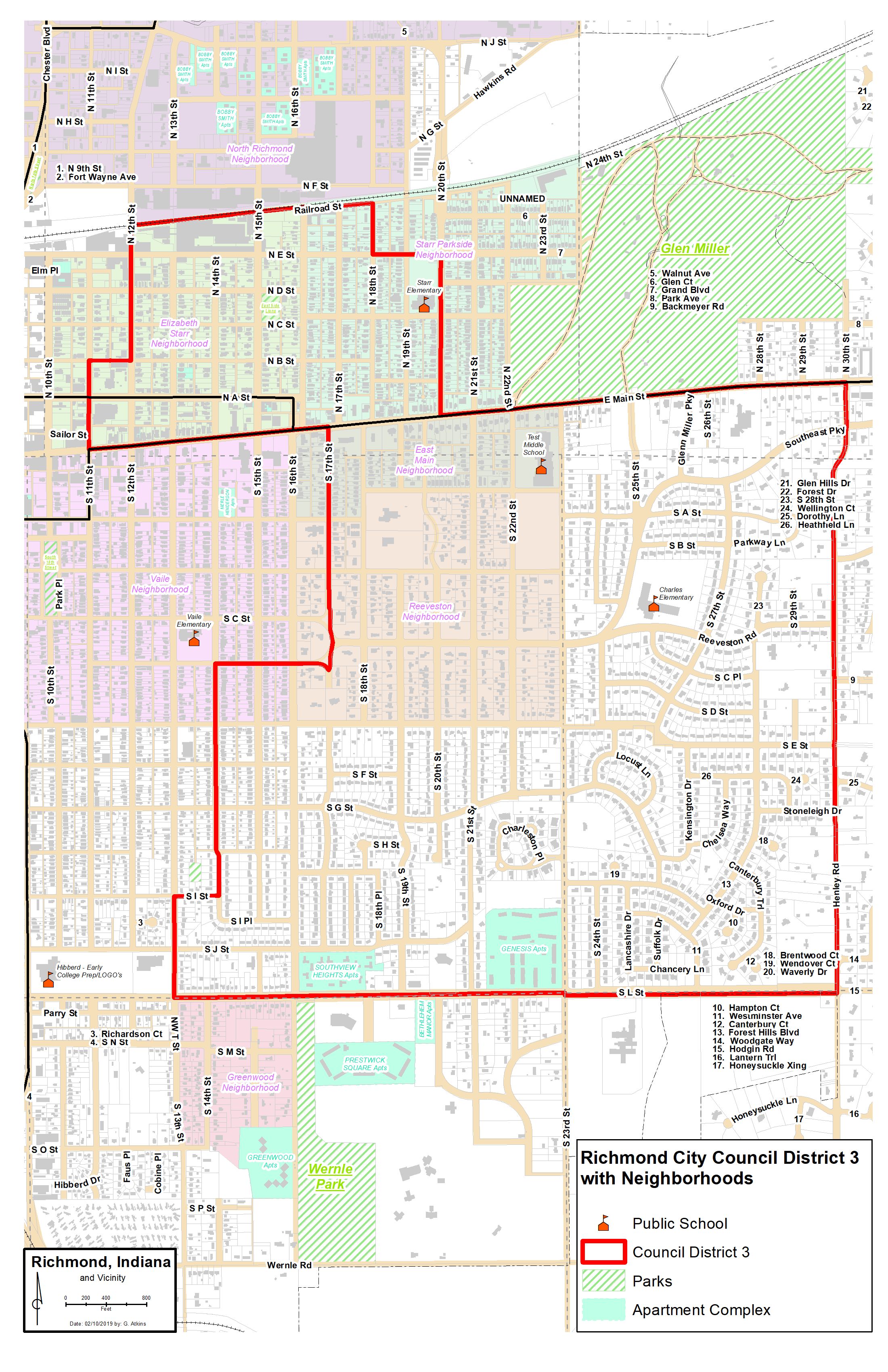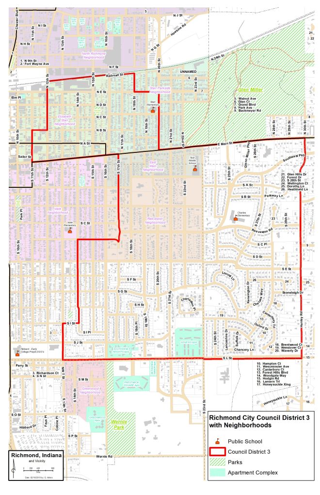 District 5 sprawls across the city’s northwest side, including the Saddlebrook and Oak Park neighborhoods, up to the Reid, IU East and Ivy Tech campuses, west to the Midwest Industrial Park and south to the Wayne County Fairgrounds and the Richmond State Hospital.